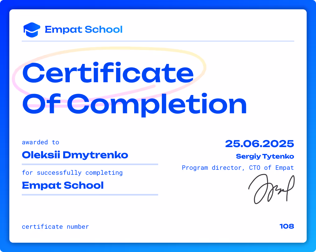 Також, по закінченню курсу ти отримаєш сертифікат від Empat! Ми плануємо стати ще крутішими та популярними, тому, повір, цим сертифікатом ти пишатимешся.